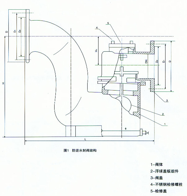 F43X-1.0T防逆水封閥主要由帶存水彎的閥體及浮球蓋板組件等組成,帶浮球的蓋板蓋在閥體的密封閥座上,將閥腔分成內外兩部分,內腔為清水部分,外腔通排水管道,當內腔充滿清水時.因位于內腔的浮球作用,蓋板壓力降低,易于開啟通流。溢流停止后,蓋板可自行復位.蓋嚴閥座,從而可嚴格阻斷臭氣及污水倒灌。如果水池進水口浮球閥關閉良好,數年不溢流,閥腔無水,浮球可加重蓋板重量,更好地蓋嚴閥座,同樣可嚴格阻隔臭氣及防止雨、污水倒灌清水池。如果污水進入閥體外腔,所帶雜物僅能粘附在蓋板外表面,不影響蓋板封嚴閥座。故該防逆水閥工作可靠,效果好,不易出故障。且當有雜物沉淀時.下次溢流時可自動沖出閥體。