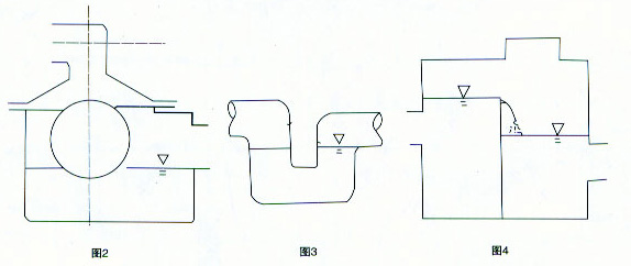 1、本防逆水封閥裝于清水池溢流管上,以前的防逆水封閥(圖2)及存水彎(圖3)或溢流井(圖4)在閥內無水時,均不能阻隔臭氣進入清水池,而當清水池進口浮球鞋閥很好時,尤其是新建水池,往往很少溢流甚至數年無溢流,因而,上述三種裝置均不能防止下水道臭氣進入清水池,而本防逆水封閥的蓋板浮球結構則可無論是否有水均可阻隔臭氣,保持清水池良好的衛生狀況。